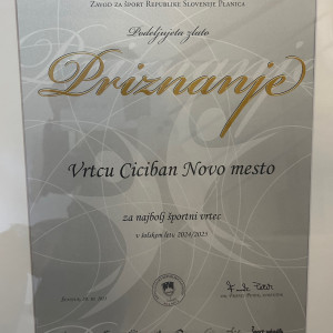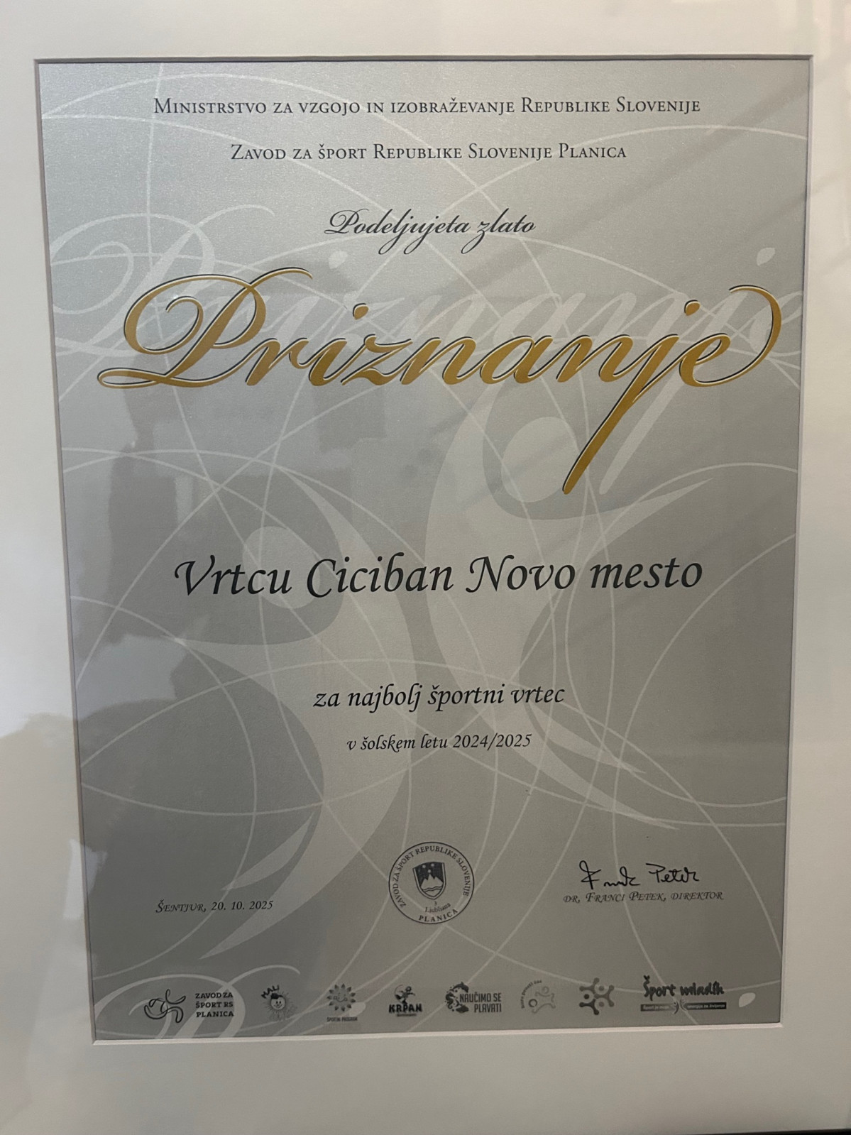 V Šentjurju je potekala slavnostna podelitev za natečaj Naj športni vrtec ali šola, kjer je naš vrtec prejel zlato priznanje. Ponosni smo, da se lahko pohvalimo s tako pohvalo, saj v našem vrtcu res dajemo poudarek na to, da je gibanje izrednega pomena za otroke.