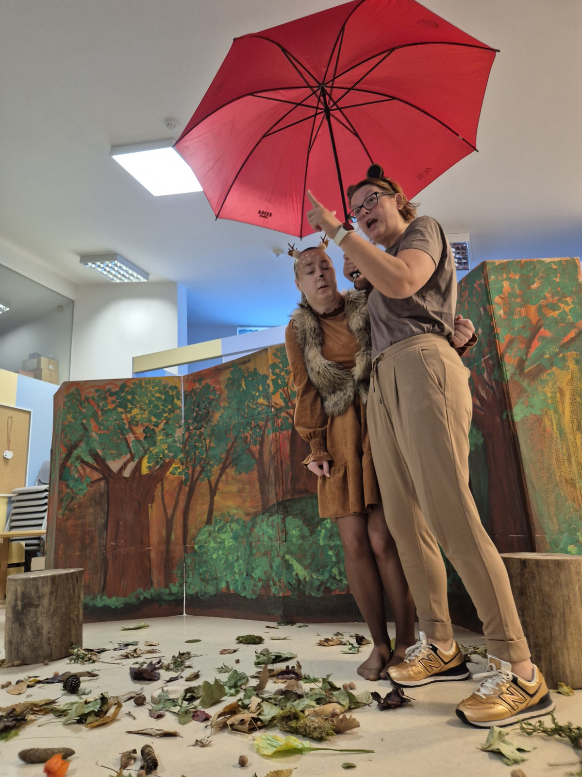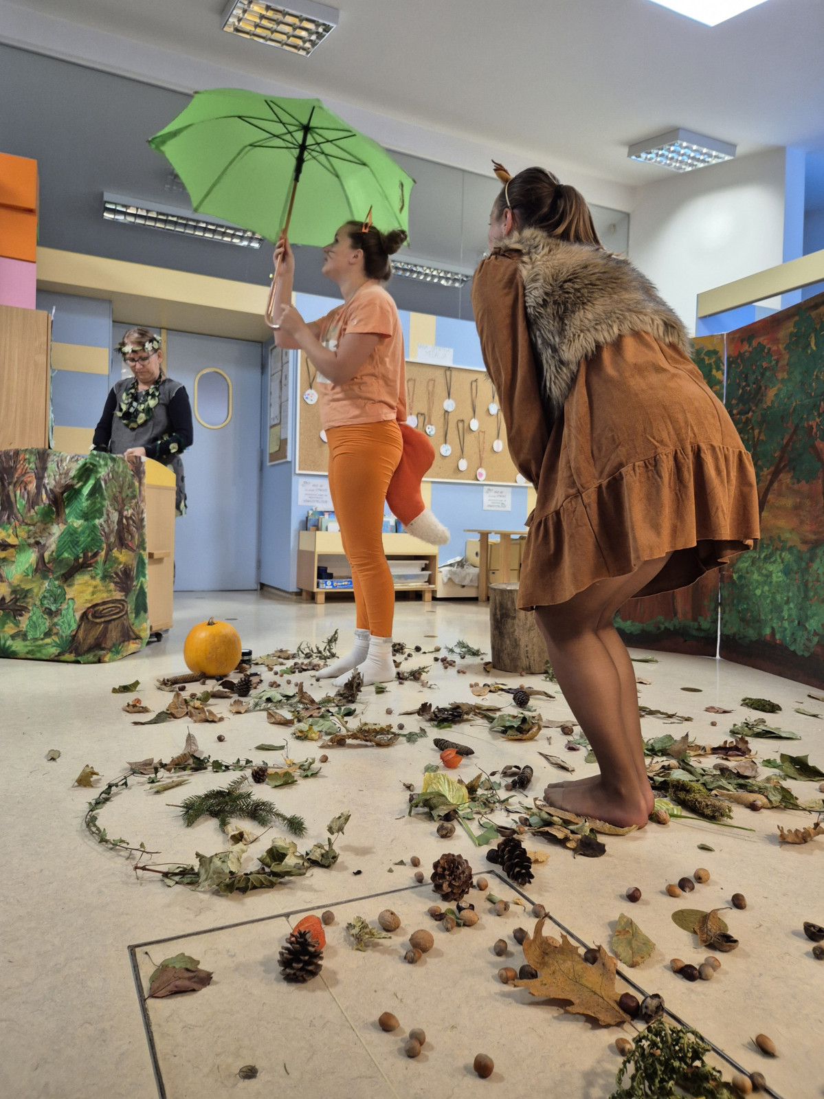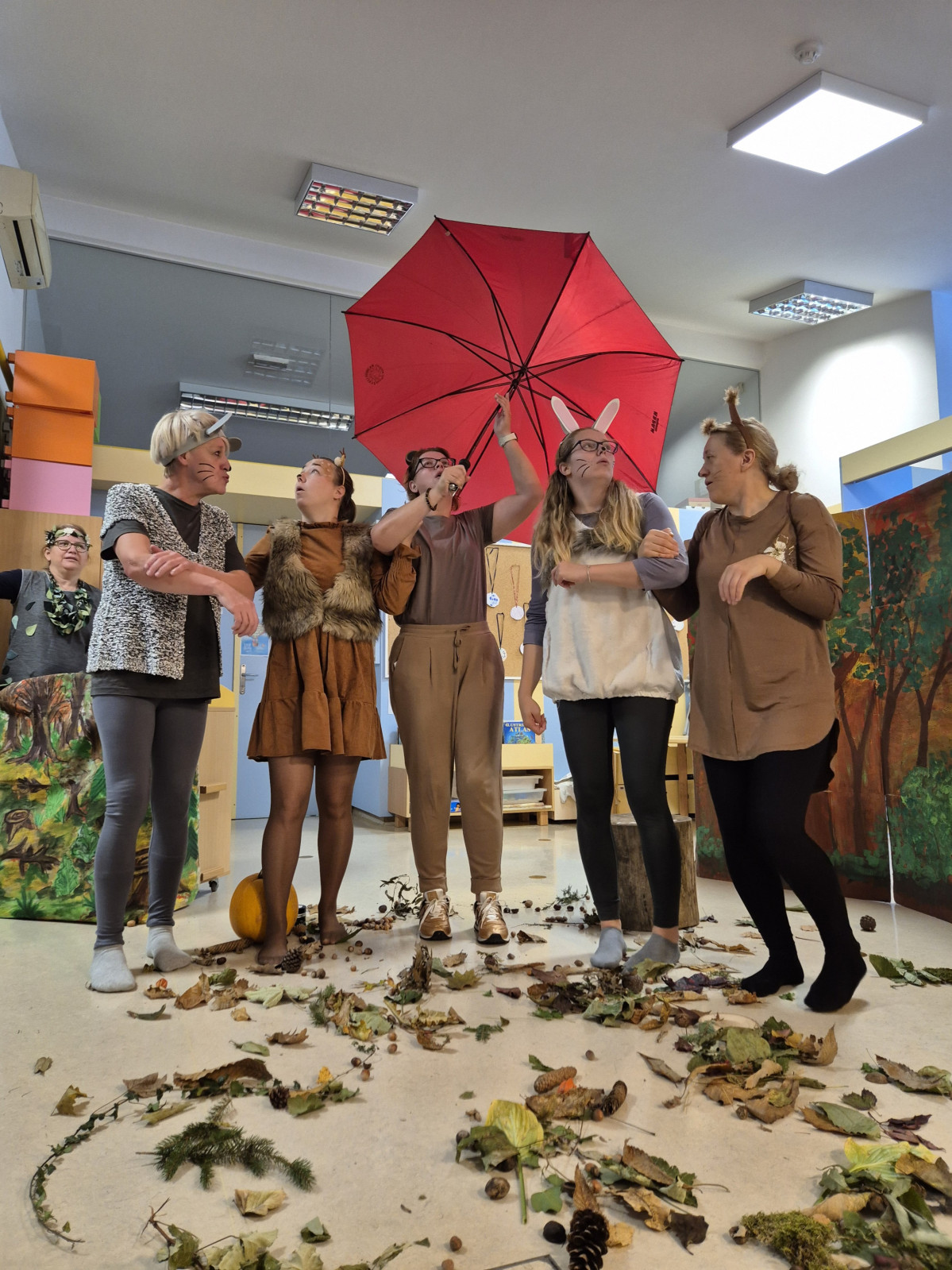 Strokovne delavke enote smo za vse skupine pripravile in odigrale gledališko predstavo po znani zgodbi Pod medvedovim dežnikom. Predstava je bila zasnovana z velikim poudarkom na prijazni komunikaciji, medsebojnem spoštovanju ter pozornem poslušanju drug drugega – vrednotah, ki jih želimo otrokom približati tako skozi igro kot skozi vsakdan.
