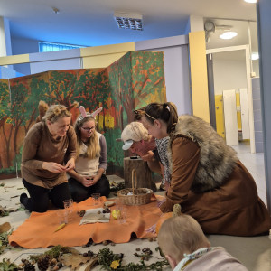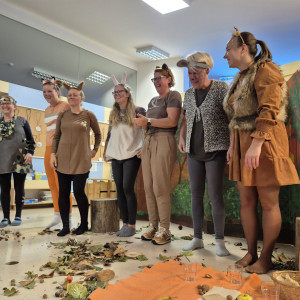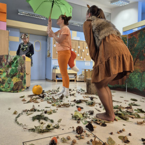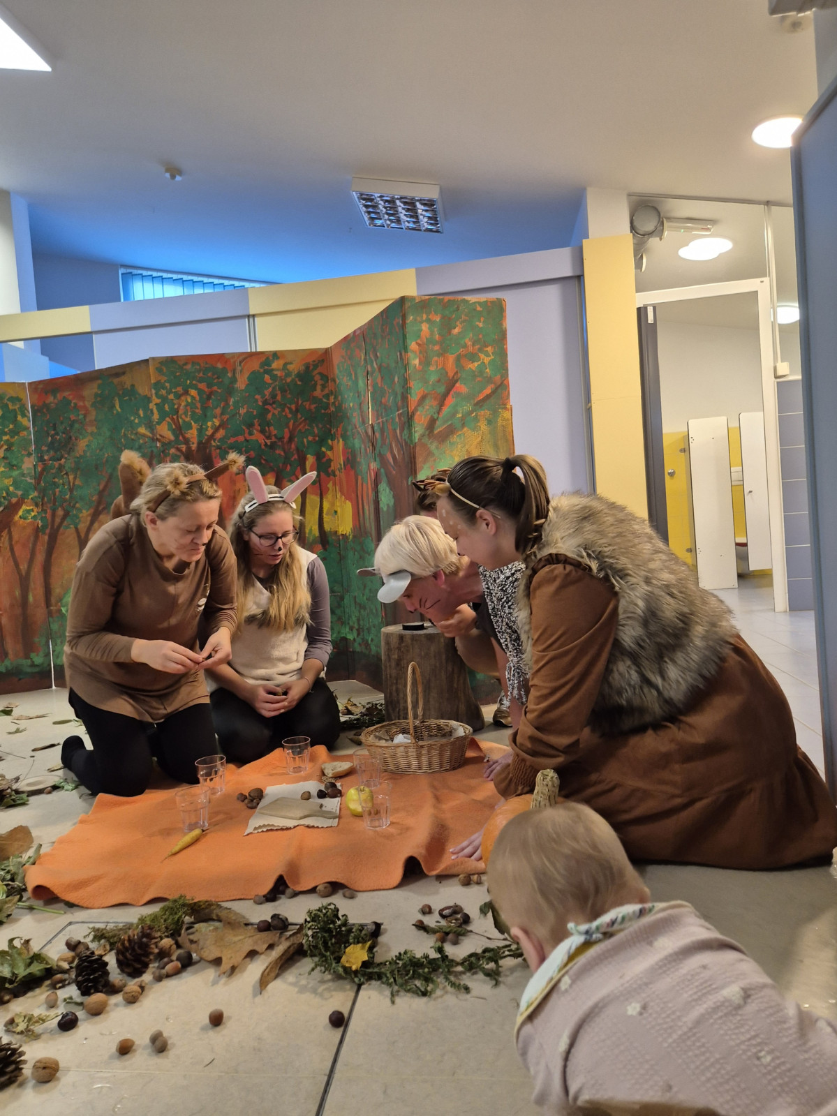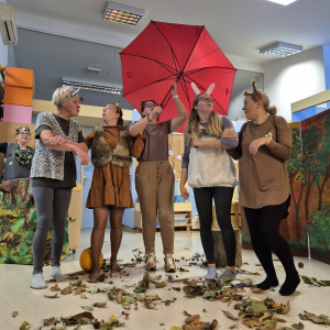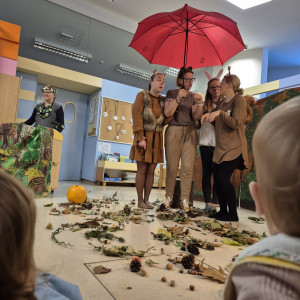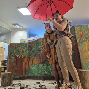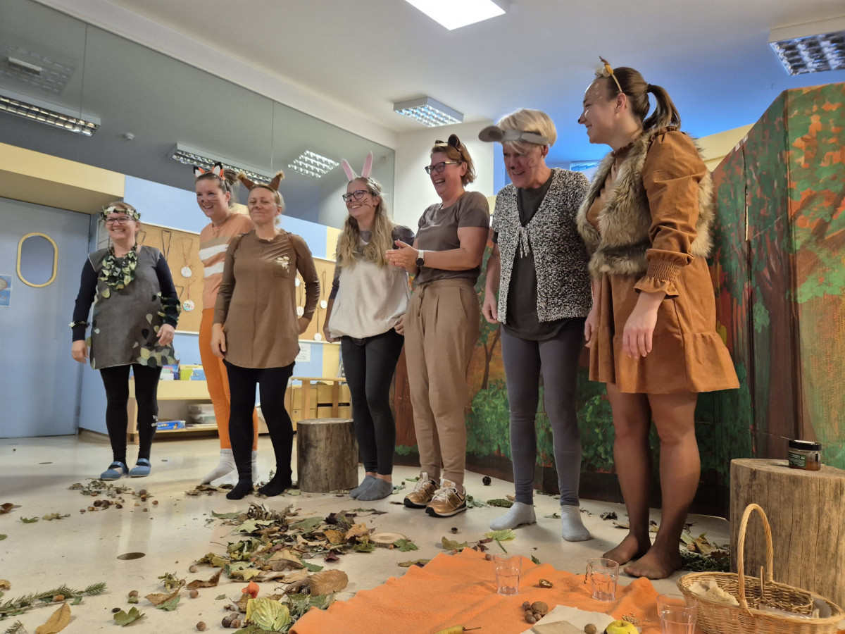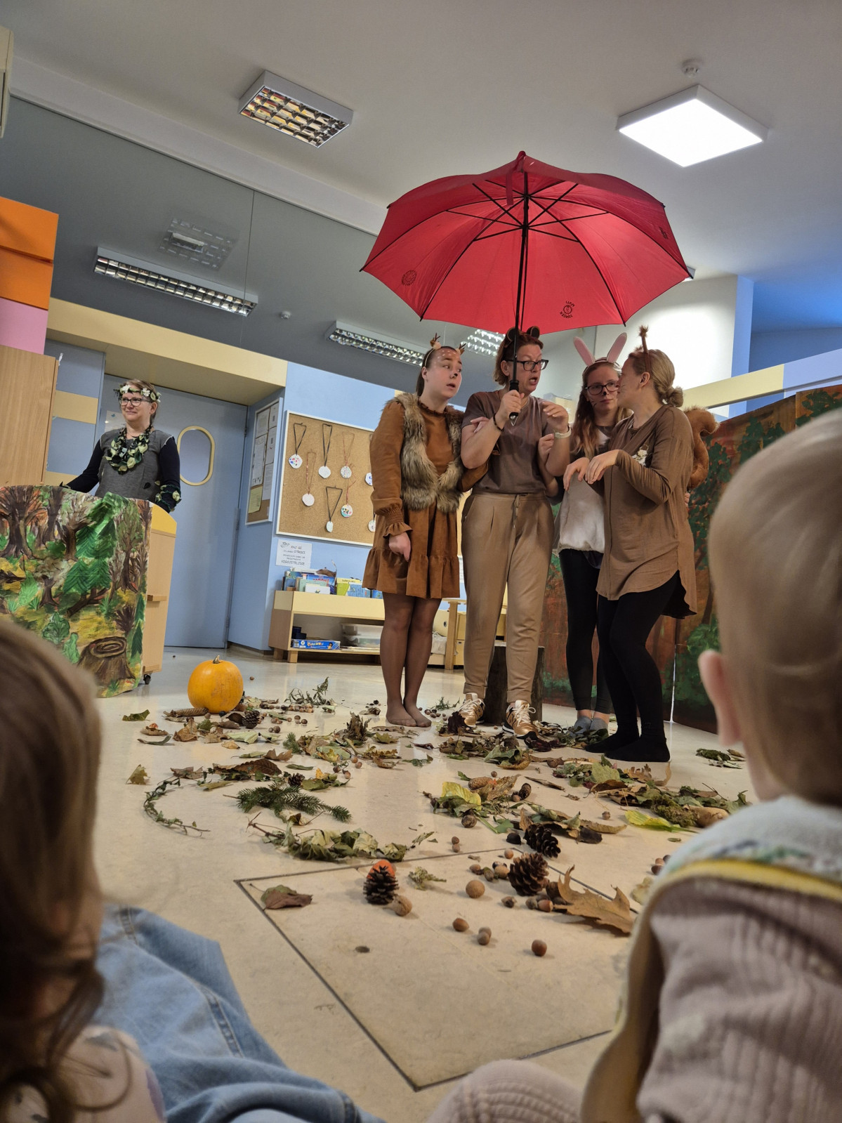 Strokovne delavke enote smo za vse skupine pripravile in odigrale gledališko predstavo po znani zgodbi Pod medvedovim dežnikom. Predstava je bila zasnovana z velikim poudarkom na prijazni komunikaciji, medsebojnem spoštovanju ter pozornem poslušanju drug drugega – vrednotah, ki jih želimo otrokom približati tako skozi igro kot skozi vsakdan.