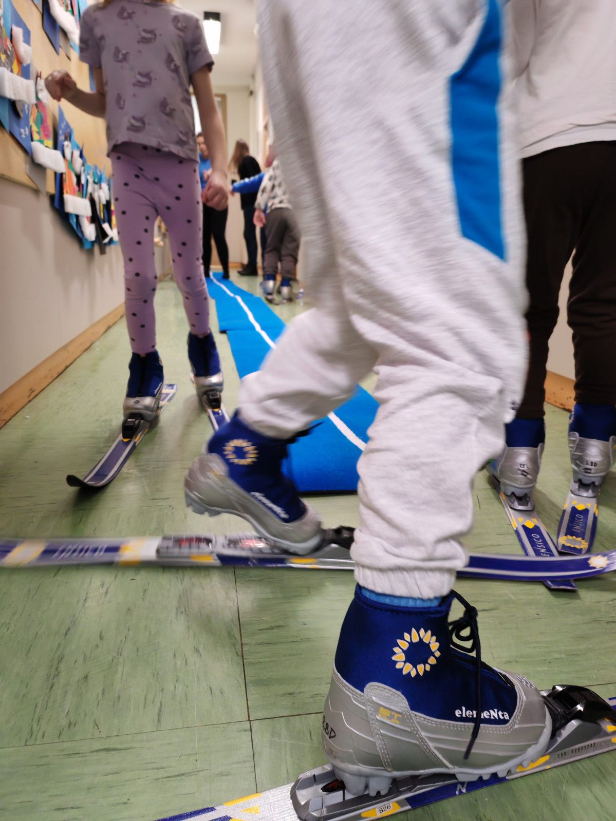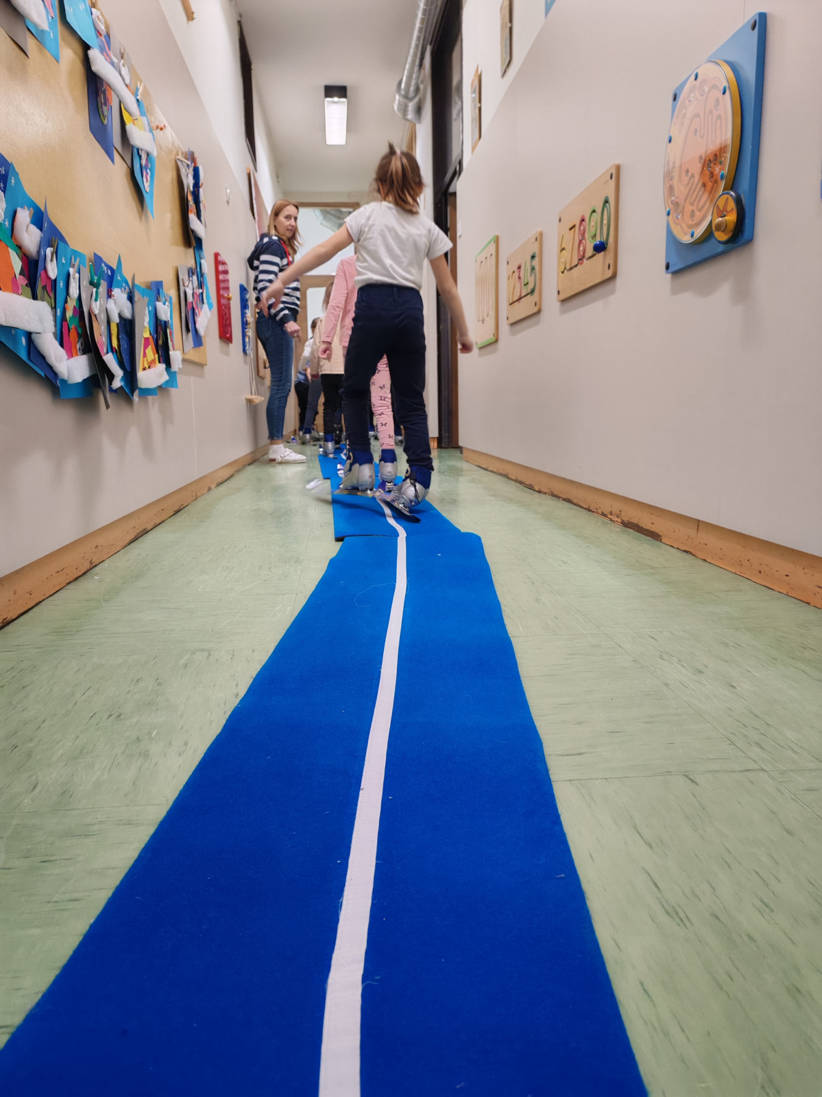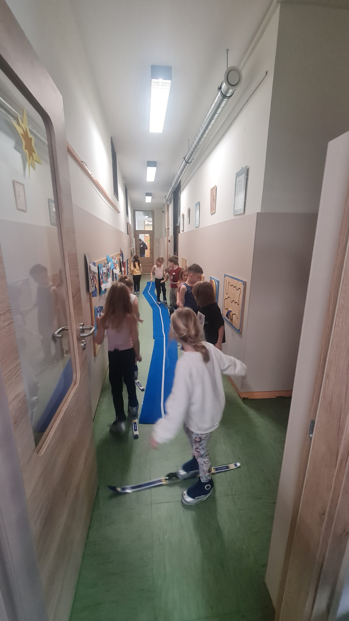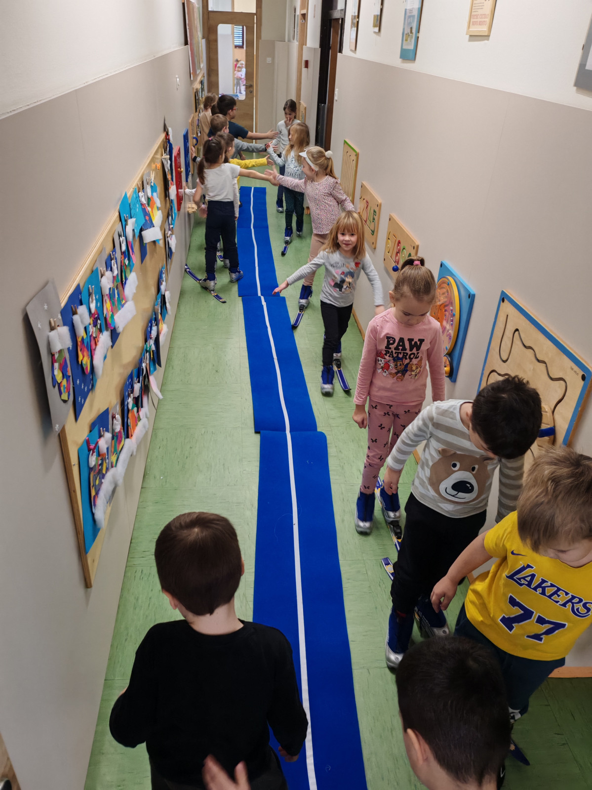 Otroci so z velikim navdušenjem spoznavali tek na smučeh. Po temeljitem ogrevanju so si nadeli čevlje, se učili pravilne uporabe smuči in pod vodstvom mentorice ZNM naredili prve smučarske korake kar na hodniku vrtca. Postopoma so se navajali na gibanje – najprej z eno smučko, nato z obema – ter z veliko zbranosti in veselja osvajali nove gibalne veščine.
