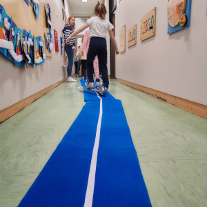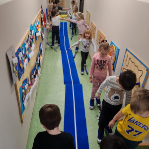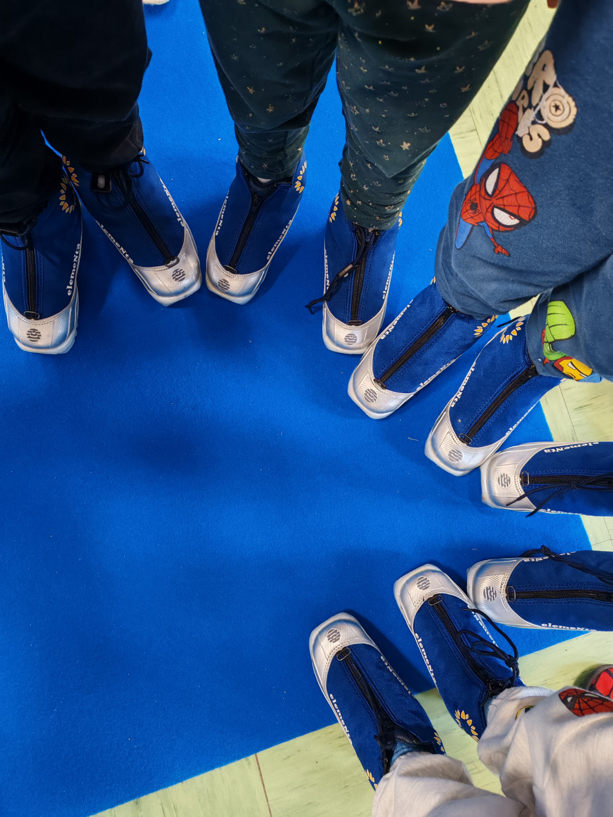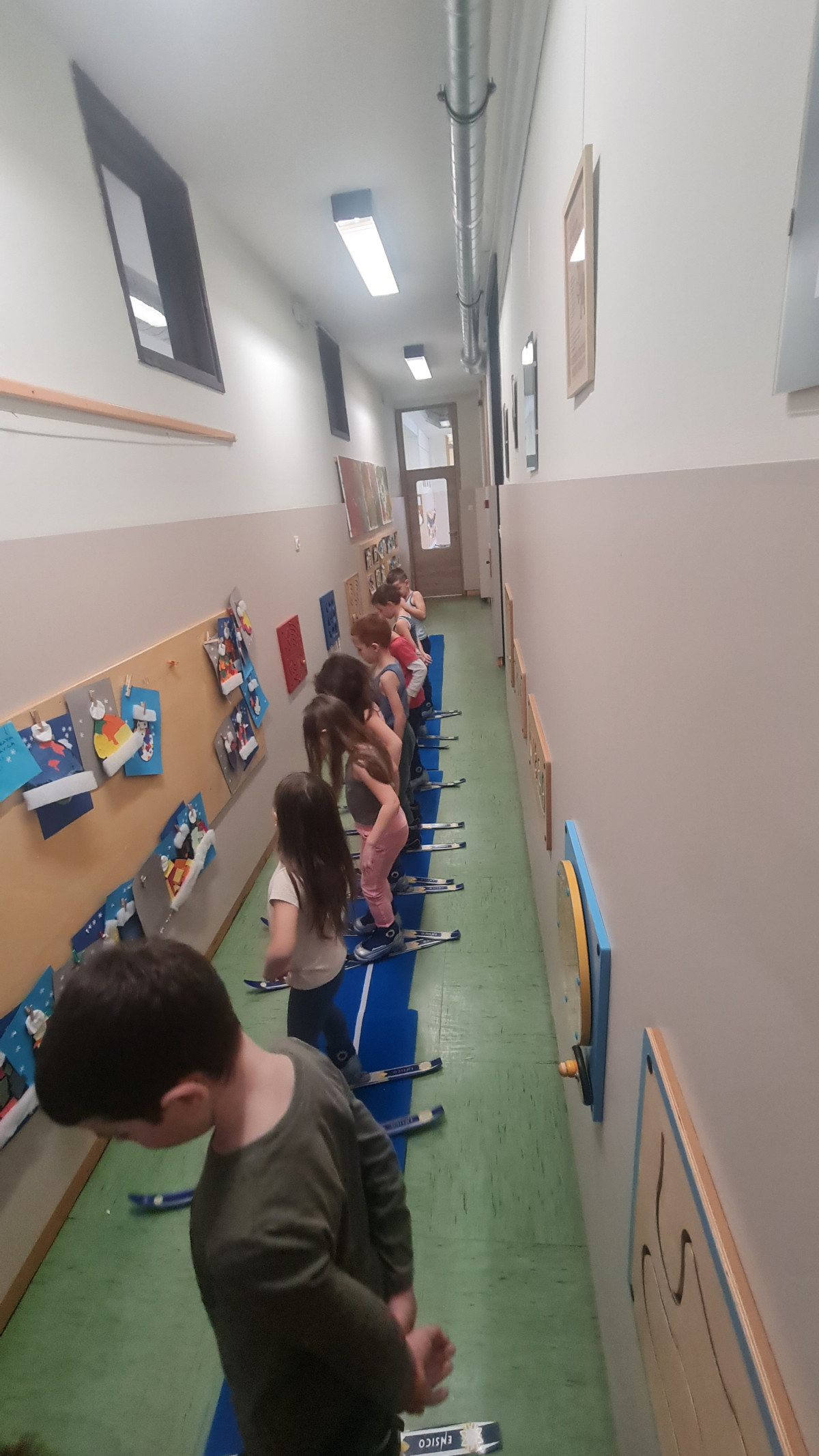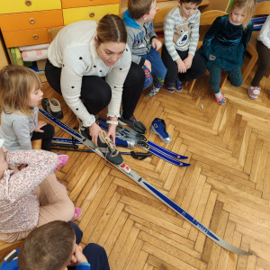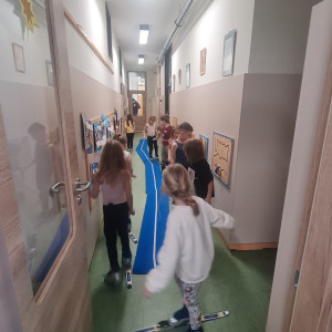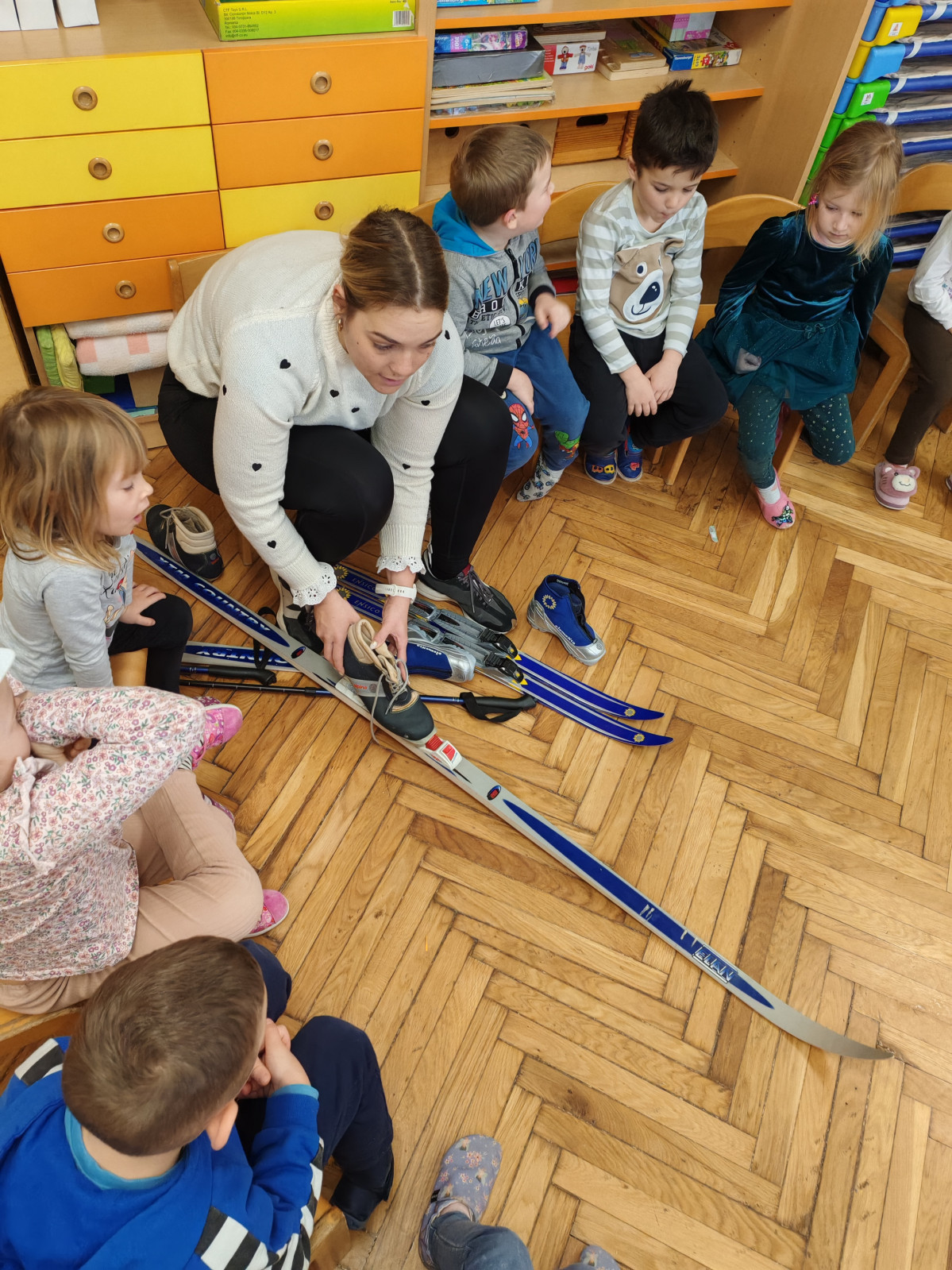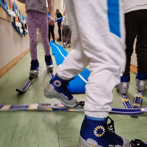 Otroci so z velikim navdušenjem spoznavali tek na smučeh. Po temeljitem ogrevanju so si nadeli čevlje, se učili pravilne uporabe smuči in pod vodstvom mentorice ZNM naredili prve smučarske korake kar na hodniku vrtca. Postopoma so se navajali na gibanje – najprej z eno smučko, nato z obema – ter z veliko zbranosti in veselja osvajali nove gibalne veščine.